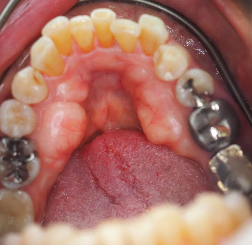 歯茎が薄くなっており、こぶが薄っすらと見えるので、その部分が白っぽくなっていることから気づくことが多いです。